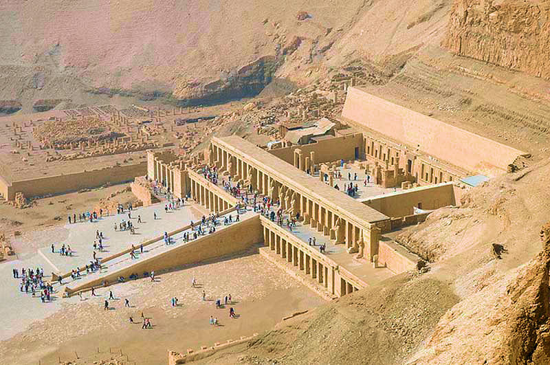 The Temple of Queen Hatshepsut: Featuring an exceptional architectural style by the standards of the time. It consists of three terraces superimposed one on top of the other. The whole is backed by the Theban mountain.